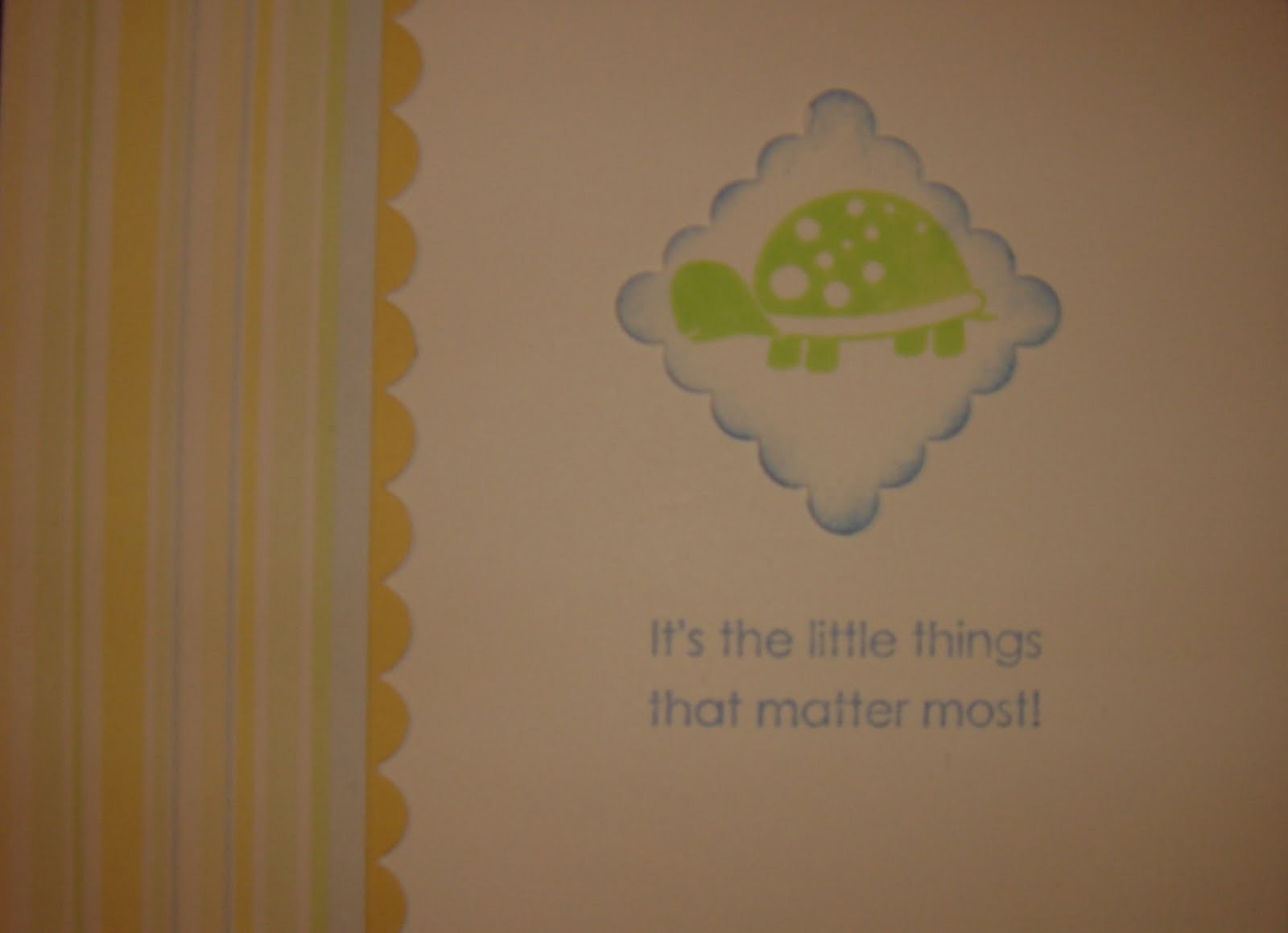 I saw a card layout I liked so I tried to duplicate it for a baby boy card, my card turned out to be more plain then I wanted it but it's all I have time for tonight. Sorry for the darkness of the photo, I couldn't win there either if I scanned it the card was basically all white & with a camera I got this. Except for the turtle stamp, everything else I went back in time & retrieved some old SU! stuff I still had. Please tell me y'all have old DSP?