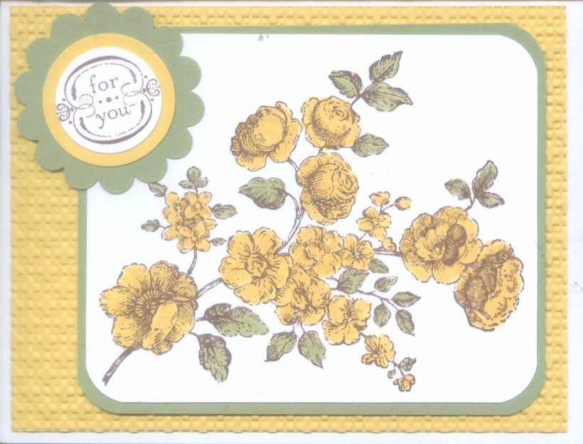 Stamps-Elements of Style; Ink- Basic Brown; Paper- Whisper White, Daffodil Delight, Pear Pizazz; Other- Square Lattice embossing folder, 1" & 1 1/4" Circle punch, Scalloped Circle punch, Corner punch