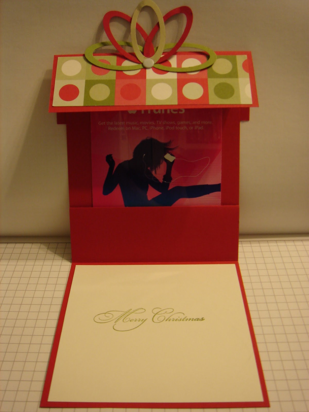 I forgot to post a cute gift card holder I found on Marie Shaughnessy's blog & actually made for my husband for his itunes stocking stuffer. His gift card wasn't a small card so I actually made my base 4.5 x 4.5, but if you head over to Marie's blog you can find the directions of how she did hers. The only thing I forgot to do cuz I ran out of time was to add a piece of velcro to the lid to keep it shut.