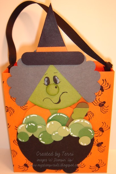 Challenge #4 was to make a fall type card. Both Frances & I happened to choose Halloween, I knew I wanted to do something with punch art, since I haven't done anything like it in a very long time & with all these owl punches being dressed up I just had to do something. At the last minute I decided I wanted to do a witch with her cauldron, but couldn't get my witch to look just right, which is where Kim Score came in. I thought her witch face was cute so I had to CASE it. After finishing the witch up she was a little too tall to make into a card so I ended up making a small trick-or-treat box with her. I hope you enjoy our projects.