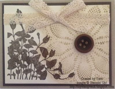 Today's retiring card features My Friend & Hello Doily. I really love these 2 sets although you wouldn't be able to tell since I think the only cards I've made with them are at classes. Maybe I'll have more time to something with them now that I don't have the "pressure" to use them. Yep that's my excuse & I'm sticking to it!