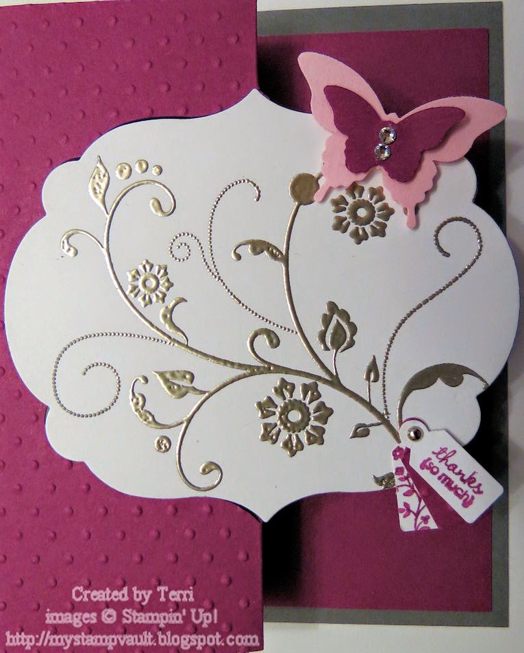 Other: Perfect Polka Dots TIEF, Bitty Butterfly punch, Elegant Butterfly punch, Jewelry Tag punch (retired), Rhinestone jewels, 1/8" mini brads, Gold embossing powder