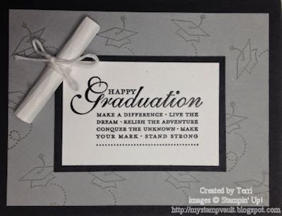 Today's card showcases a happy time for many Seniors around the nation, GRADUATION! While this card may take on a masculine look, you could incorporate the school colors of your graduate which personalizes it was well. To make the diploma all I did was roll a piece of Whisper White cardstock! To all those who are graduating, Congratulations!