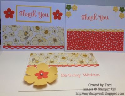 We made a cute little purse with 3 cards/envelopes. I can see this purse holding at least 3 more cards with their envelopes. On top of that I'm sure if you redo the measurements you can make even a wider purse. I'm really sorry but beyond the punches used, I'm no help I tried looking for the DSP but haven't found the name of it yet. The ribbon is retired from I believe SAB a few years ago. Hope you enjoy!