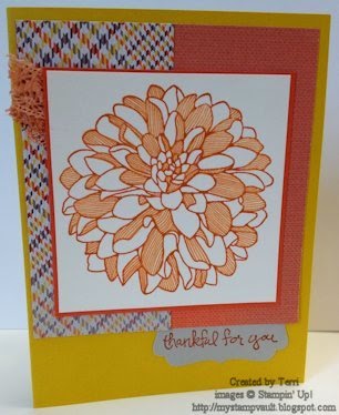 For this week's challenge I decided to use the Regarding Dahlias set & use more fall colors. Now I can't tell you if this is a typical fall flower as I don't have a green thumb whatsoever, but I think it works well.