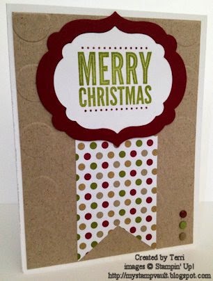 With this hibernation, means a bit of stamping is being done here & there. Today's card is an easy mass producing instance of that. I used the set Merry Everything from the Holiday Catalog using Old Olive & Cherry Cobbler Ink stamped onto Whisper White Card Stock which had been die-cutted out using Labels Collection Frame-lits. I also die-cutted the Cherry Cobbler piece with the same frame-lits. I used the retired Be Of Good Cheer DSP to make the banner with the Banner Frame-lits. Behind that I used Crumb Cake embossed with the Large Polka Dots TIEF & backed it with Whisper White. For the dots I used the Regal, Brights & Neutrals Candy Dots.