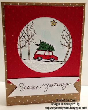 Today's card uses the sets White Christmas & Endless Wishes from the Holiday Catalog. The base is Crumb Cake Card Stock which we then dotted up using the Signo Gel Pen. Next we stamped the trees, car & star from the set onto Whisper White with Chocolate Chip Ink. We colored in the trees with Crumb Cake, the car with Real Red, the Christmas Tree with Garden Green, the star with Daffodil Delight & then sponged the sky area with Pool Party. I later added in the Dazzling Details onto the snow to add some shimmer. Jewel Rhinestones were added to the words & the star. We ran the Real Red piece through the Big Shot to put the circle from the Circle Collection Frame-lits in the middle then ran it through again to emboss it with the Perfect Polka Dots TIEF.