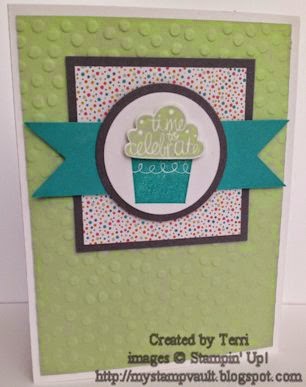 Today's card uses the Cupcake Party Stamp Set & is a very easy & quick card to make. Card base layer uses Whisper White Card Stock. Followed by Pear Pizazz embossed with the Decorative Dots TIEF. For the square I used Basic Gray & the retired Confetti Celebration DSP. I fussy cut a 1" strip of Bermuda Bay to make the banner. For the top, I again used Basic Gray followed by Whisper White where I stamped the base of the cupcake in Bermuda Bay. I finished the cupcake by stamping the top in Pear Pizazz, punched it out used the Cupcake Builder Punch & popping it up using Stampin' Dimensionals.