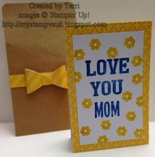The kit comes with enough to make 8 pocket cards in 2 colors Pacific Point & Crushed Curry. I first assembled the Kraft pocket except for the twine I see. The set that comes with the kit is called Love You A Lot, which has a lot of words & a few picture stamps.