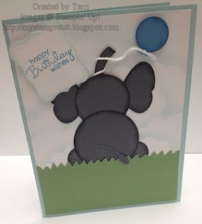 The base of the card we used Pool Party Card Stock, followed by Whisper White Card Stock. On the white piece we sponged clouds using Pool Party Ink with a 2 3/8" Scalloped Circle Punch as a guide. Next, we fussy cut a piece of Wild Wasabi Card Stock to make it look like grass. Punches used to make the elephant were- 3/4", 1 1/4" & 1 3/8" Circle Punches, Butterfly Punch (cut in 1/2) & Bird Builder Punch. Balloon was made with 3/4" Circle Punch & Owl Builder Punch. After putting the elephant together we wrapped Whisper White Twine around the trunk before adhering it to the card stock, then tied a knot at the end & stuck it to the balloon. We stamped the sentiment from Petite Pairs onto Whisper White Card Stock with Marina Mist Ink, punched it out using the Decorative Label Punch & sponged around the edges using Pool Party Ink. I so need to get back to doing punch art!