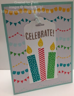 I made a card today to "CELEBRATE"! Which could also work for a birthday theme, but I thought I would celebrate the new catalog. For this card, I used a new set called Build A Birthday along with a sentiment from Celebrate Today which was a rollover from the Occasions Catalog. For the base, I used Pool Party Card Stock followed by the new Cherry On Top DSP. Next, I took a 2" piece of Whisper White Card Stock punched it with the Scallop Tag Punch, then stamped the candles using Bermuda Bay, Watermelon Wonder, Cucumber Crush & Crushed Curry Ink. The sentiment was stamped in Tip Top Taupe Ink. Lastly, I added a piece of retired Pool Party Baker's Twine to match the base of the card.