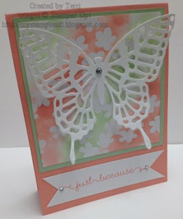 For the base, we used Crisp Cantaloupe Card Stock. For the next 2 layers we used Pistachio Pudding & the Sale-A-Bration Irresistibly Yours DSP. I sure miss last years in-colors especially these 2. Next, we sponged over the DSP paper with Crisp Cantaloupe & Pistachio Pudding Ink, to make it a faux white on white embossing look. We stamped the sentiment from A Dozen Thoughts Stamp Set in Crisp Cantaloupe Ink onto a piece of Whisper White Card Stock then fussy cut the banner ends. Kerri cut out the butterfly beforehand using the Butterfly Thinlets. Lastly, we added the Jewel Rhinestones to the butterfly & banner.
