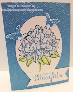Today's card uses the new hostess set Best Thoughts. For the base, I used Marina Mist Card Stock embossed using the Big Shot & the new Elegant Dots TIEF. I stamped the flower from the set using Memento Black onto Whisper White Card Stock, coloring it in with Marina Mist & Old Olive Ink, then cut it out using the Big Shot & Oval Framelits. Next, I stamped 2 butterflies from Kinda Eclectic on Whisper White Card Stock scraps in Marina Mist Ink & punched them out using Bitty Butterfly Punch then added a Pearl Jewel to each one. To finish the card I stamped the greeting from the Best Thoughts Stamp Set in Marina Mist Ink onto Whisper White, then used the Banner Triple Punch to make it a banner.