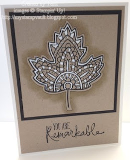 My first card, I saw a card on Pinterest where the demo did this for a whole background but I decided on just 1 leaf, because I love the look of it. Sorry I don't know who did the card I'm talking about as I lost the card & couldn't find it again. I used Whisper White Card Stock for the card base followed by a layer of Crumb Cake Card Stock which I stamped one of the sentiments from the Remarkable You Stamp Set in Memento Black Ink. For the main image I stamped the biggest leaf from the Lighthearted Leaves Stamp Set, stamped in Memento Black Ink, after that was dry I went around to different areas of the leaf & colored in with the Uni-ball Signo Gel Pen. When all that was done, I went to my Big Shot & die cut the leaf using the Leaflets Framelits, then sponged around the negative piece with Crumb Cake Ink, this was then attached to a Basic Black Card Stock layer which was attached to the card.