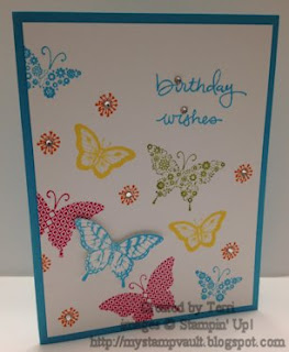 Today's card takes me back to spring with all the butterflies, even though the weather outside is more fall like, but that's ok I'll take both seasons. For this card we used the Papillon Potpourri Stamp Set with Tempting Turquoise, Old Olive, Daffodil Delight, Melon Mambo & Tangerine Tango Ink stamped on Whisper White Card Stock, adding to each of the flowers Rhinestone Jewels. The sentiment uses Tempting Turquoise Ink with the Endless Birthday Wishes Stamp Set, also adding Rhinestone Jewels to the "i" dots. This was then layered onto the Tempting Turquoise Card Stock base.