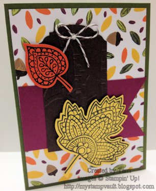 For this card I went with a fall theme once again, using pretty much things from the Holiday Catalog. For the base of the card I used Mossy Meadow Card Stock, followed by Into The Woods DSP. Next I added a strip of Rich Razzleberry Card Stock which I punched one end with the Banner Triple Punch. For the label, I used Early Espresso Card Stock that I had embossed using the Big Shot & the Woodland TIEF, then punched an end with the Ornate Tag Punch & added a bow with Early Espresso Baker's Twine. For the leaves, I stamped two of the leaves from the Lighthearted Leaves Stamp Set using Memento Black Ink onto Daffodil Delight & Tangelo Twist Card Stock, then die cutting it with the Big Shot & the Leaflets Framelits & put them on Stampin' Dimensionals before adhering them to the card. I can't get enough of the this set & to think I wasn't going to get it because I have so many retired leaf sets, but I'm glad I did.