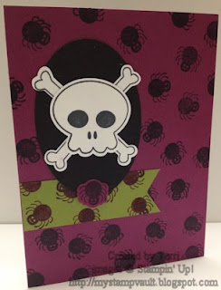 So for today's card I decided to do a Halloween card, not usually cards I make but I just had to have the Howl-O-Ween Treat Stamp Set in the Holiday Catalog. Not 100% sure why, but I did like the owl & figured I could use him for other things, hopefully my thoughts will work. So I started with a Rich Razzleberry Card Stock base & stamped the spider stamp in Memento Black Ink all over it. Next, came the banner which I used Old Olive Card Stock, punched the end with the Banner Triple Punch, then stamped the spider in Rich Razzleberry Ink. I used the Oval Framelits to cut a Basic Black Card Stock oval from, I decided 1 oval was enough instead of the 2 in the sketch. For the skull & bones, I used Memento Black Ink stamped on Whisper White Card Stock then cut them using the Boo To You Framelits, afterwards I cut the bones in 1/2 so that you could see both sides on either side of the skull. Lastly I stamped the spider in Memento Black Ink onto Rich Razzleberry Card Stock & cut it out using the Boo To You Framelits. Voila that is my card in a nutshell, I hope you like it!