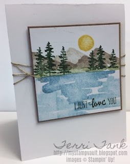 Today's card I made for my hubby, as we are celebrating our 25th Wedding Anniversary. I started with a Whisper White Card Stock base, where I wrapped the Linen Thread around the front of the card. Next, I used the Waterfront Stamp Set to stamp on Whisper White Card Stock a scene using Daffodil Delight Ink- Sun, Crumb Cake Ink- Mountains, Pear Pizazz Ink-grass, Garden Green Ink- Trees & Marina Mist- water. I used a sentiment from the Petal Palette Stamp Set & stamped it using Garden Green Ink before attaching this piece to Crumb Cake Card Stock & adhering it to the card with Stampin' Dimensionals.