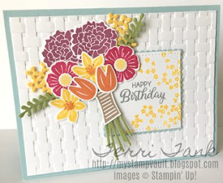 I started the card off with a Soft Sky Card Stock base, followed by a layer of Whisper White Card Stock that I ran through the Big Shot using the Basket Weave TIEF. Next, I got to stamping the flowers from the Beautiful Bouquet Stamp Set on Whisper White Card Stock using Sweet Sugarplum (going to so miss this color), Daffodil Delight, Tangerine Tango & Melon Mambo Inks. For the wrap I used Crumb Cake Ink. I went back to the Big Shot to die cut all the flowers, wrap & a few additional pieces that weren't stamped but used Daffodil Delight Card Stock & Pear Pizazz Card Stock with the help of the Bouquet Bunch Framelits. Next, I used Whisper White Card Stock to die cut a square from the Stitched Shapes Framelits & Soft Sky Card Stock cut out the scalloped square using the Layering Squares Framelits. I then stamped a sentiment from the set using Smoky Slate Ink & surrounded it with a bit more color with Daffodil Delight Ink flowers.