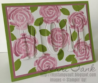For this card, I chose to use a new stamp set called Abstract Impressions. I used Whisper White Card Stock to stamp the flower from the set using the retiring Sweet Sugarplum Ink *insert sad face*, stamped off once for the solid stamp & full on with the line stamp. I decided to use only 2 of the 3 rose stamps. For the leaf, I used a new ink color called Granny Apple Green. Next, I used the Big Shot with the Large Letter Framelits to cut out Mom from the stamped layer, then backed this with a Sweet Sugarplum Card Stock layer so that I could prop the cut-out letters using Mini Stamp Dimensionals. The card was finished off with a base of Granny Apple Green Card Stock.