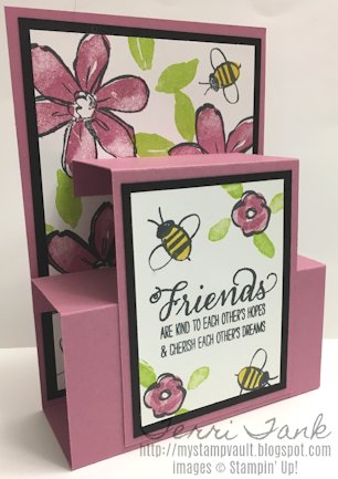 For the base of the card & back layer of the small fold, I used the retiring Sweet Sugarplum Card Stock, followed by a layer of Basic Black Card Stock on both sections. For the stamped layers, I used Whisper White Card Stock where I used the retiring Garden In Bloom Stamp Set with Memento Black, Sweet Sugarplum, Lemon Lime Twist & Daffodil Delight Inks. To attach each section to its proper place I used Tear & Tape Adhesive.