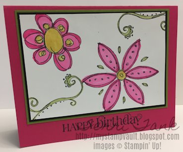 We started with a Melon Mambo Card Stock base, followed by layers of Old Olive & Basic Black Card Stock. For the stamped piece, we used Whisper White Card Stock where we stamped the flowers & swirl from the retired Doodle This Stamp Set in Memento Black Ink. We had the option of using Marvelous Markers, Blends or watercoloring them with Blender Pens. I chose to use Melon Mambo, Daffodil Delight & Old Olive Blends to color with. We used a sentiment from the retired Curly Cute Stamp Set with Memento Black Ink onto the base of the card.