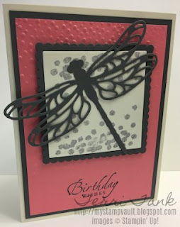 For this card, we started out with a Very Vanilla Card Stock base followed by a layer of Basic Gray Card Stock & then with layer two of Flirty Flamingo Card Stock that was embossed using the Big Shot & the Softly Falling TIEF & stamped with a sentiment from the Sincere Salutations Stamp Set using Basic Gray Ink. Next, we took a square piece of Very Vanilla Card Stock & stamped it with Basic Gray Ink (stamped off once) to stamp the dots from the Dragonfly Dreams Stamp Set, this was then backed by a piece of Basic Gray Card Stock that was run through the Big Shot with the Layering Squares Framelits, then attached to the card with Stampin Dimensionals. The dragonfly was cut out using the Big Shot with the Detailed Dragonfly Thinlets which I probably should have attached after I put the background square on so that its wings wouldn't have gone past the end of the card. I so love this set & all the possibilities that can be done with it.