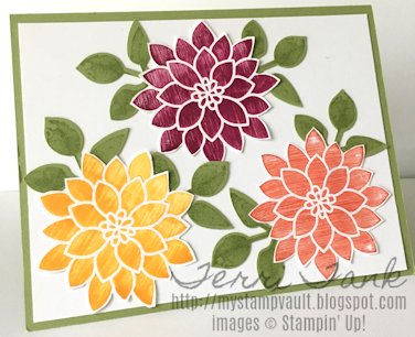 For this card, I started with a Pear Pizazz Card Stock base, followed by a layer of Whisper White Card Stock. Next, I used the Flourishing Phrases Stamp Set to stamp the flower from the set using Mango Melody, Poppy Parade & Berry Burst Ink, then fussy cut the flowers out. These weren't the original colors I had selected but some colors ended up being very similar that I changed them up at the last minute. I then used one of the leaf stamps from the Painted Harvest Stamp Set to stamp Pear Pizazz Ink onto the same color card stock before punching it out using the Leaf Punch. I then used the Tombow Multi Glue to adhere the leaves & flowers in a way that they fit onto the card.