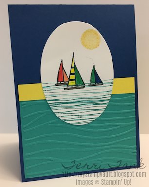 This week's BSU challenge is a sketch created by Stace. I had a hard time with this sketch because what I had in my mind just wasn't turning out on paper, so I switched it up & decided to make this scene using the Lilypad Lake Stamp Set with Bermuda Bay Ink (water), Daffodil Delight Ink with a Sponge Dauber (sun), along with Pineapple Punch, Grapefruit Grove, Call Me Clover, Lovely Lipstick, Blueberry Bushel & Soft Suede Marvelous Markers (ships). Next, I ran a piece of Bermuda Bay Card Stock through the Big Shot using the Seaside TIEF then topped it with a piece of Pineapple Punch Card Stock. This was all adhered to a Blueberry Bushel Card Stock base.