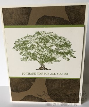 For my card, I decided to use a new stamp set called Rooted In Nature. I started my card with a base of Very Vanilla Card Stock, a neutral I don't use nearly as much as I should, but what can I say I like the brightness of Whisper White. For the next layer, I used a Soft Suede Card Stock & made my own background using the trunk in the set with Soft Suede Ink. For the stamped piece, I used the big oak tree (I think that is what it is!!) from the set stamping it with both Old Olive & Soft Suede Ink. Next, I stamped the sentiment from the set in Old Olive Ink. To finish off the card, I backed this piece with a layer of Old Olive Card Stock. A nice simple card, just the way I like it.
