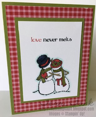 I started off with a base of Old Olive Card Stock, followed by a layer of retired Quilted Christmas DSP. For the stamped piece, I used Whisper White Card Stock & stamped the snowman pair from the Spirited Snowman Stamp Set using Memento Black Ink. I colored them in with Basic Black Stampin' Marker, along with Dark Real Red & Dark Old Olive Stampin' Blends. I took the Light Pool Party Stampin' Blends & went around them as I have seen many people do I assume for shading but I thought I'd give it a try. Lastly, I stamped a sentiment from the set using Real Red Ink for the "love" & Memento Black Ink for the "never melts" part.