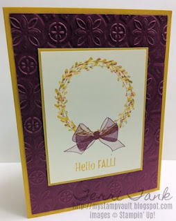 I started with a Crushed Curry Card Stock base followed by a layer of Rich Razzleberry Card Stock that I had run through the Big Shot using the new Tin Tile TIEF to emboss the paper. Next, I took a piece of Very Vanilla Card Stock & took the wreath stamp from the Wishing You Well Stamp Set & went about using a technique called Thumping. Don't know how to do this? Well, I started by inking up the stamp with Crushed Curry Ink first then taking from lightest to darkest- Pumpkin Pie, Old Olive, Cajun Craze & Rich Razzleberry Stampin' Write Markers thumping them individually all over the stamp so that you get specks of all the colors within the stamp. Before I stamped I gave the stamp a huff of air to reactivate the colors in case any started to dry a bit before I was ready. I then stamped the pretty bow from the above set using Rich Razzleberry Ink. Since I couldn't find a sentiment along the lines of fall in any of my current sets I went to my retired stash & found one in the Merry Cafe Stamp Set, using the Crushed Curry Stampin' Write Marker to color just the part of the sentiment that I wanted to use.