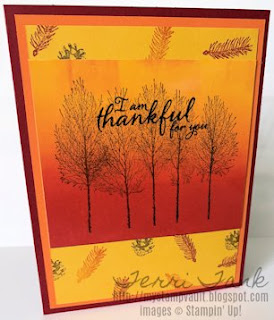 For today's card, I pulled out my brayer something I haven't used in forever & made my own mixture of colors using Crushed Curry, Pumpkin Pie & Cherry Cobbler Inks. After loading up my brayer I went back & forth over a piece of Glossy Cardstock, until I achieved the look I wanted. Next, I stamped the trees from the Winter Woods Stamp Set using Soft Suede Ink, then added the sentiment from the Painted Harvest Stamp Set using Early Espresso Ink. I then set this aside & took out the Crushed Curry Cardstock layer, stamped the feather & the pine cone from the Winter Woods Stamp Set using all but the Early Espresso Ink from above. Once I was finished, I added these 2 layers to a Pumpkin Pie Cardstock layer & then to the Cherry Cobbler Cardstock base.