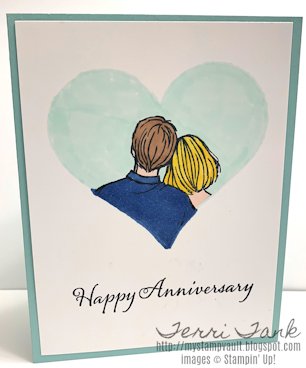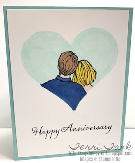 I started this card as a Valentine's Day card but it soon switched over to an anniversary card since my husband & I will celebrate our 26th wedding anniversary. YIKES, I feel old even saying that! To start this card off I began with the stamping on Whisper White Cardstock. I used the retired Sweet & Sassy Framelits to make a mask to stamp over the heart using a new Occasions Catalog set called To Have & To Hold with Memento Black Ink. Before removing my mask I outlined the heart with the Light Pool Party Stampin' Blends & colored it in. I used the Light Daffodil Delight, Light Night Of Navy, Bronze & the retired Ivory Stampin' Blends to color in the couple. I then added a sentiment from the set using Memento Black Ink, before attaching it to a Pool Party Cardstock base. This card was very easy to make & the good thing about it is you could really use anything to color it in (markers, chalks, watercoloring, etc.)