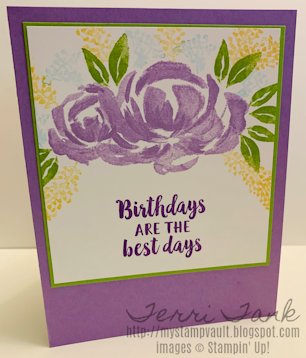 Today's card is a birthday card I made for a friend with the new set Beautiful Friendship. This is one of the sets I fell in love with when I first saw it in the catalog. I'm a floral set lover & while this set was a little intimidating at first I was able to make this. I started with a Whisper White Cardstock layer, stamping the roses in Highland Heather Ink, the leaves in Granny Apple Green Ink & the spritzes were Balmy Blue Ink & So Saffron Ink. The sentiment was stamped using Gorgeous Grape Ink. Once I was done stamping I attached it to Granny Apple Green Cardstock then a Highland Heather Cardstock base!