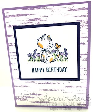 I started the card off with a Highland Heather Cardstock base, followed by a layer of Whisper White Cardstock that I used Birch Stamp Set with Highland Heather Ink. Next, I took a small piece of Whisper White Cardstock & stamped one of the kitty stamps from the Pretty Kitty Stamp Set using Memento Black Ink. I then used various colors of Stampin' Blends to color in he scene. The sentiment is from the Itty Bitty Birthday Stamp Set which was stamped using Memento Black Ink. This was then attached to a layer of Basic Black Cardstock before being attached to the rest of the card.
